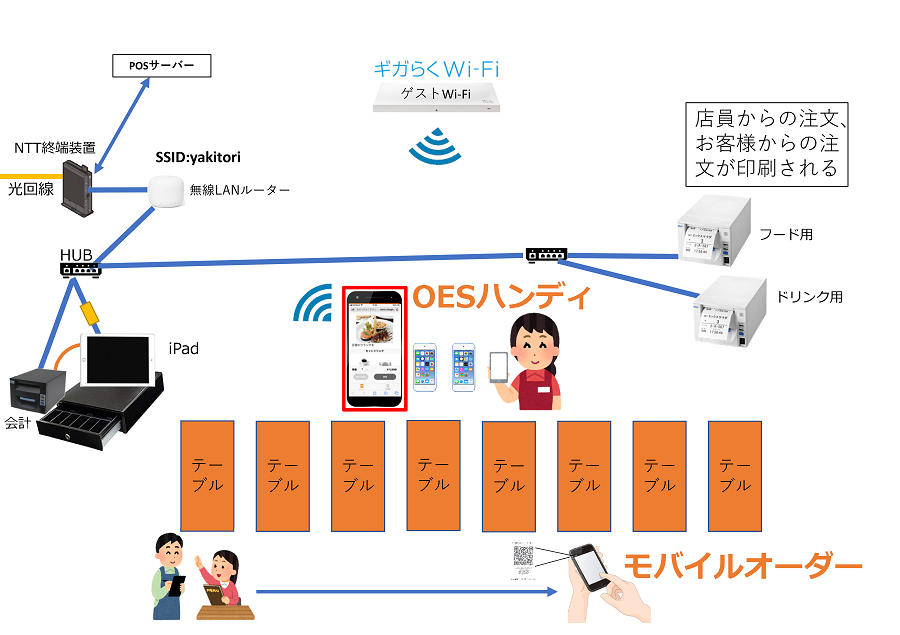 ※スマホを持っていないお客様へは、店員が従来通りテーブル席で注文を聞いてOESハンディで注文を飛ばします。