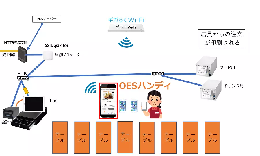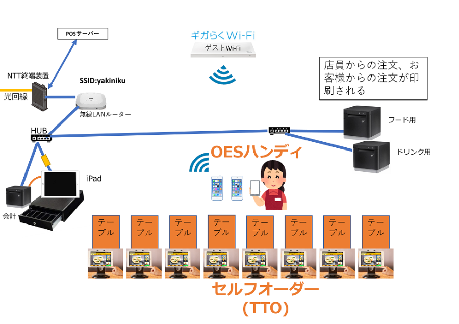 (注)「OES(オーダーエントリーシステム)ハンディ」とは、ホールの店員さんがお客様からの注文を伺い厨房に注文メニューを伝えるものです。テーブルに据付けたタブレットから注文する「セルフオーダー(TTOともよばれます)」などもあります。
