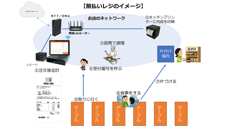 (1)お客様が入店し注文したいメニューを伝えお会計します。➡(2)注文内容はキッチンプリンターに印刷され、調理を始めます。➡(3)出来上がり次第受付番号を告げ、レシートに印刷された番号のお客様が料理を取りに行きます。(4)食べ終わった後は、指定の場所にお客様が置きに来てもらう仕組みです。